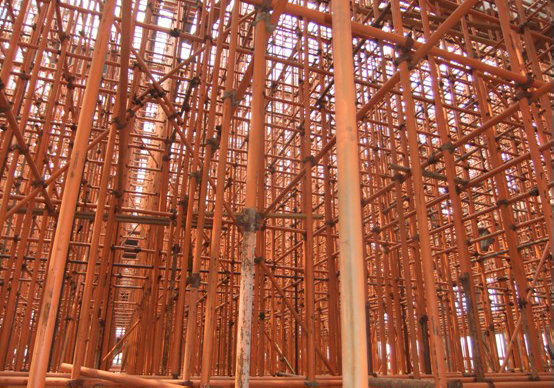安陽建工邯鄲分公司承建的臨漳文化藝術(shù)中心項目,占地150畝,建筑面積13165平方米,計劃投資4500萬元,集大型會議中心、文化演藝中心、影視播放中心、群眾文化活動中心為一體。其中會議大廳跨度20米,高13.5米,長40米,附跨高度8.5米,建筑面積約2000平方米,結(jié)構(gòu)施工為高支模系統(tǒng),是本工程的難點和重點。施工前,公司工程部及技術(shù)中心組織了支模方案論證,并多次到現(xiàn)場指導(dǎo)施工,進(jìn)行模板驗收,制定澆筑方案。7月15日進(jìn)行砼澆筑,采用兩臺泵車,經(jīng)過10個小時的澆筑,順利完成會議大廳結(jié)構(gòu)施工。
