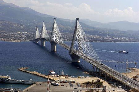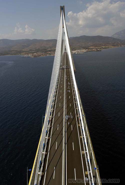 里永·安蒂里永大橋,該大橋全長2883米,連接希臘大陸和伯羅奔尼薩半島。它不僅僅是世界上最長的斜拉橋——橋面直接用懸索吊在龍門架上,而且還是世界上技術最先進的橋梁之一。