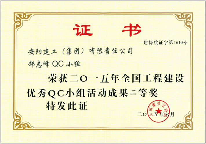 2015年6月22日—25日,中國建筑業(yè)協(xié)會工程建設(shè)質(zhì)量管理分會在云南昆明召開了“2015年全國工程建設(shè)優(yōu)秀QC小組活動成果交流會”,對2015年優(yōu)秀QC小組活動成果進(jìn)行了交流、表彰。我公司郝志峰QC小組活動成果參加此次交流會,并榮獲“2014年全國工程建設(shè)優(yōu)秀QC小組活動成果二等獎”的榮譽稱號。