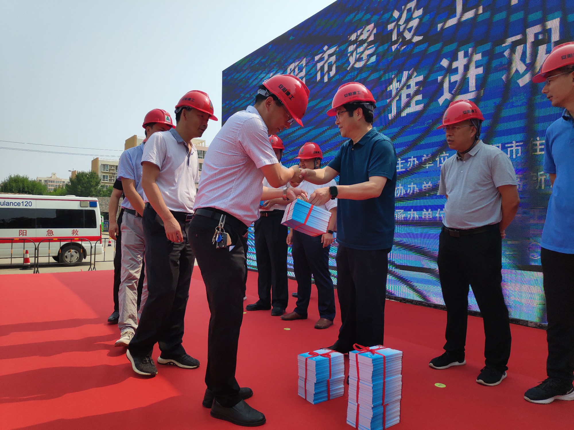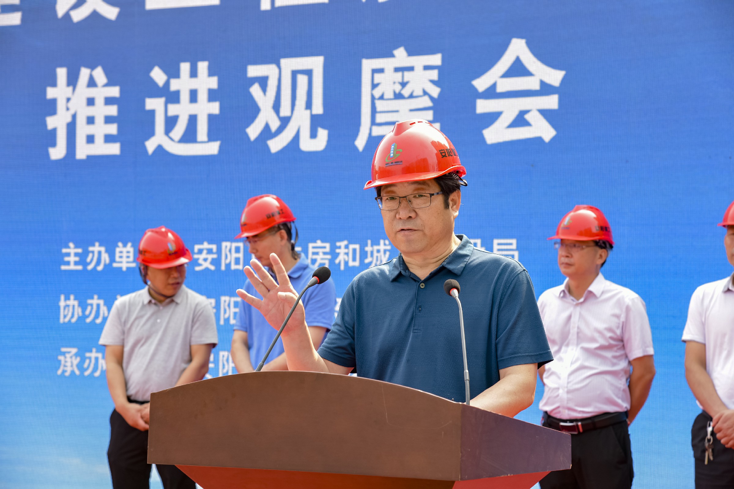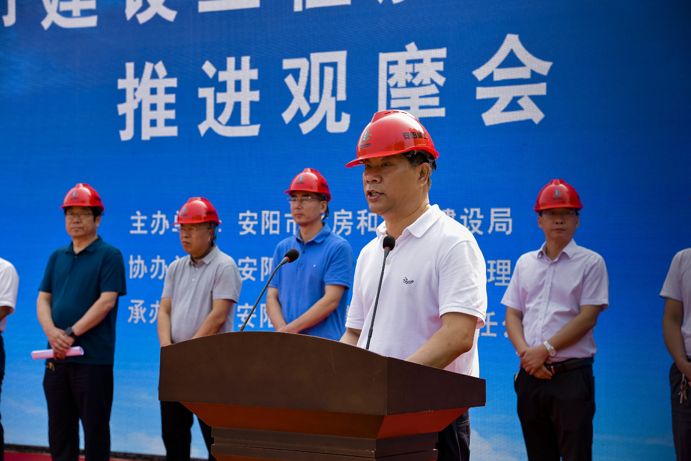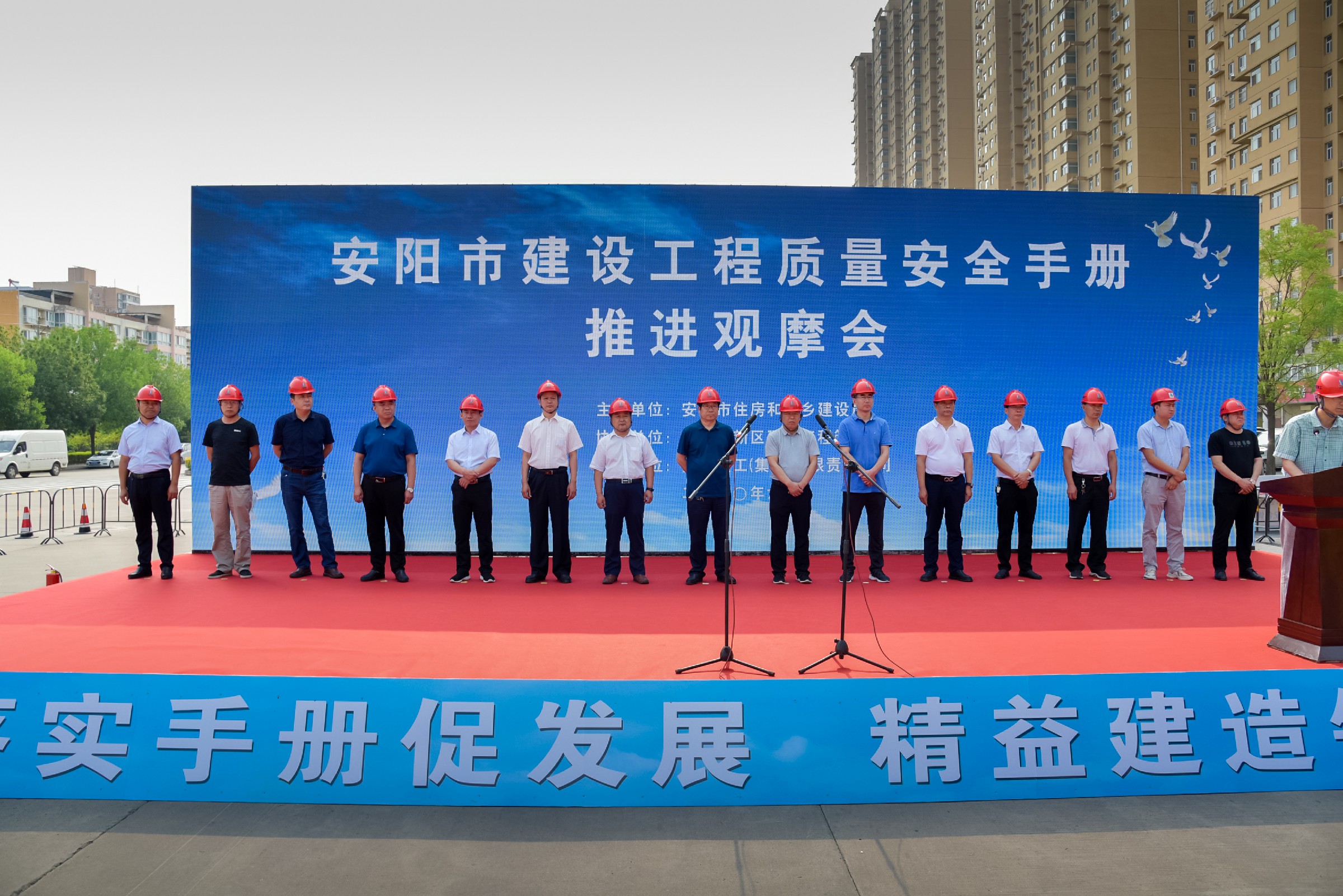 6月24日上午,由安陽(yáng)市住房和城鄉(xiāng)建設(shè)局主辦,高新區(qū)建筑工程管理處協(xié)辦,安陽(yáng)建工集團(tuán)承辦的“安陽(yáng)市建設(shè)工程質(zhì)量安全手冊(cè)推進(jìn)觀(guān)摩會(huì)”在我公司海悅名郡項(xiàng)目施工現(xiàn)場(chǎng)順利召開(kāi)。安陽(yáng)市住建局黨組成員、總工程師許會(huì)生,安陽(yáng)市住建局工程質(zhì)量安全監(jiān)管科科長(zhǎng)李奇琪,安陽(yáng)市建筑工程質(zhì)量監(jiān)督站站長(zhǎng)張向民,安陽(yáng)市建設(shè)安全監(jiān)督站站長(zhǎng)王進(jìn)現(xiàn),安陽(yáng)市市政工程質(zhì)量監(jiān)督站站長(zhǎng)李虎,各縣(市、區(qū))住建局主管副局長(zhǎng)、質(zhì)監(jiān)站、安監(jiān)站站長(zhǎng)等領(lǐng)導(dǎo)出席。集團(tuán)公司董事長(zhǎng)謝海如親臨現(xiàn)場(chǎng)觀(guān)摩指導(dǎo)、副總經(jīng)理劉民躬身一線(xiàn)督促安排。市各建筑工地的建設(shè)、施工、監(jiān)理單位相關(guān)人員約1700余人參加了此次觀(guān)摩活動(dòng)。