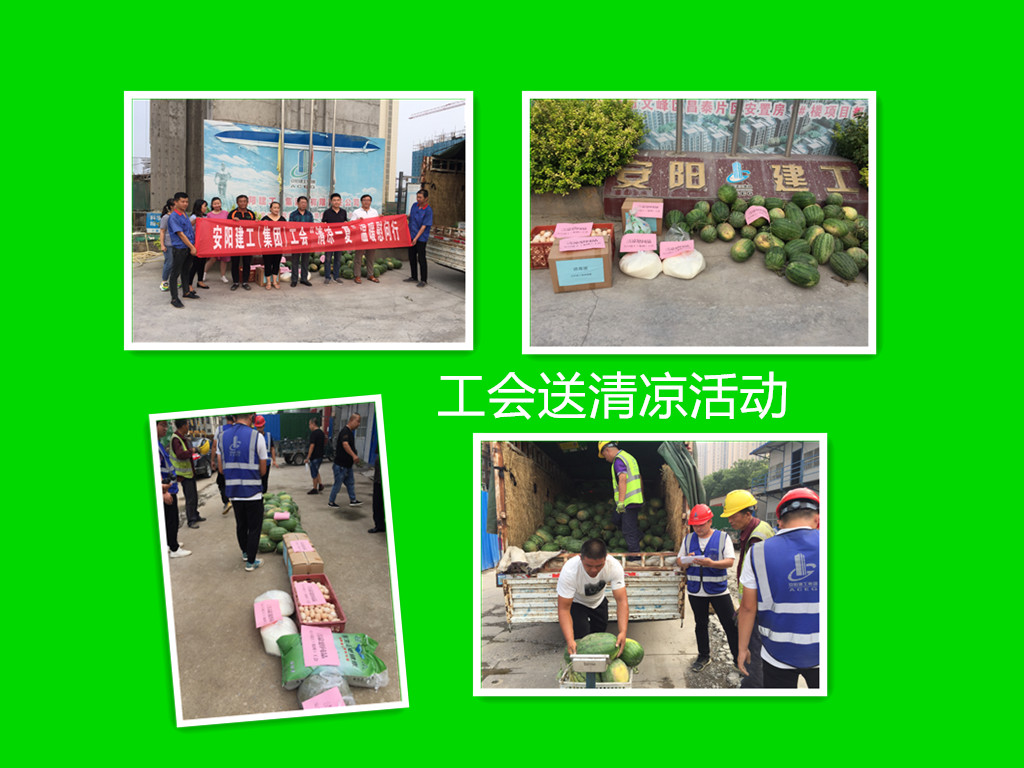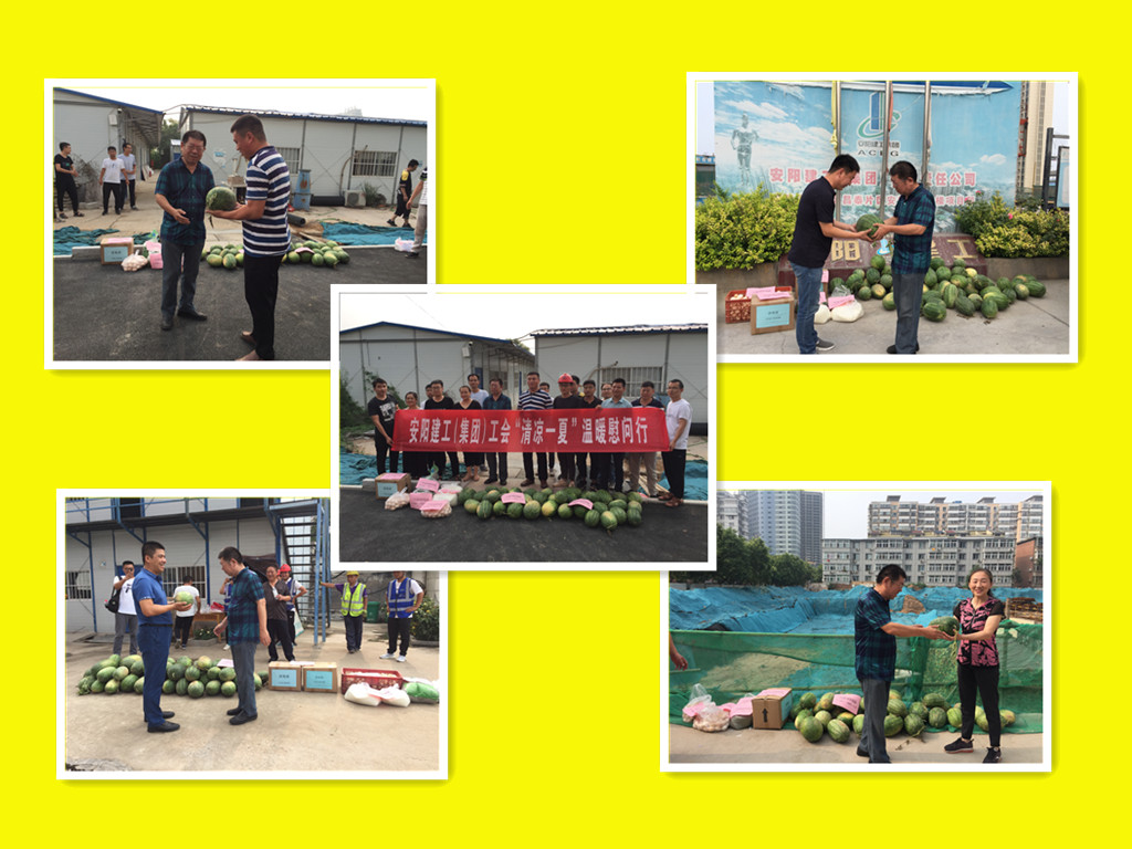 “工會(huì)送西瓜來(lái)嘍!”伴隨著工人的聲音,裝滿西瓜的汽車駛進(jìn)了項(xiàng)目部大門口,公司工會(huì)主席馬松林、副主席聶磊在公司工程部、項(xiàng)目部陪同下,帶著香甜的西瓜、營(yíng)養(yǎng)的雞蛋、溫暖的綠豆、甜滋滋的白糖、殺菌的消毒液等物品開始了今年的“清涼一夏”溫暖慰問(wèn)行!