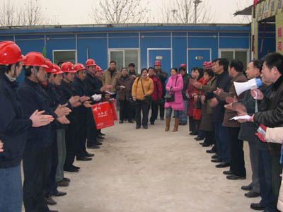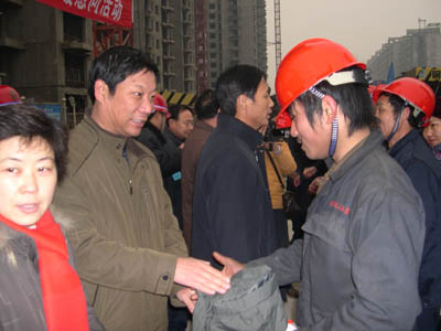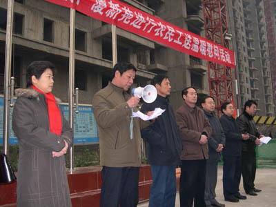 2008年1月10日是一個普通的日子,但對于建工(集團)廣廈工地上的農(nóng)民工來說卻是難忘的一天。這一天天氣格外寒冷,氣溫驟降給建筑工人戶外作業(yè)增加了勞動難度和強度。安陽建工(集團)各建筑工地上的工人師傅們和往常一樣仍堅守在各自的工作崗位上,依然認真工作、辛勤勞動著,他們絲毫沒有因為外部條件艱苦而影響了工作。安陽市總工會主席聶孟磊、副主席陰春生、保障部部長呂啟霞 、城建水利工會主席陳亮等一行在這一天帶著100件羽絨服、100本《農(nóng)民工知識讀本》和對廣大農(nóng)民工的一片關(guān)愛來到了廣廈新苑工地,為那里的農(nóng)民工送去了溫暖。公司領導謝海如、馬松林、鐘新安及市機關(guān)事務管理局廣廈新苑指揮部人員參加了這次送溫暖活動。公司黨委副書記、工會主席馬松林主持儀式。