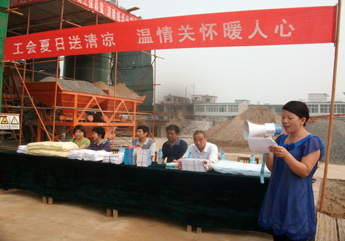 一件件防暑食品慰問品送到了工地,送到了大家的手中,送到了人們的心里,讓一線工人感受到了夏日的一片“清涼”;一句句關(guān)注安全的話語,傳遞著溫馨的祝福,表達(dá)了工會(huì)對(duì)建筑工人的深切關(guān)懷。最后工友們以響亮的口號(hào)表達(dá)了大家共同的心聲:”體民情、愛職工、感謝工會(huì)送清涼,戰(zhàn)高溫、斗酷暑、努力工作保施工!”