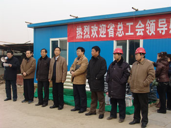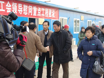 元月10日(周日)上午,省總工會(huì)及市總工會(huì)領(lǐng)導(dǎo)冒著嚴(yán)寒,帶著精美的羽絨服、精制的大米、白面和美味的豬肉及《農(nóng)民工知識(shí)讀本》來(lái)到我們公司施工的安陽(yáng)市電子信息學(xué)校工地,向建設(shè)一線職工和在這里務(wù)工的農(nóng)民工送去了溫暖,送去了工會(huì)組織對(duì)農(nóng)民工的深切關(guān)懷。