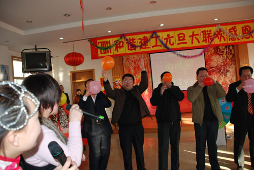 聯(lián)歡會(huì)在優(yōu)美的舞蹈《春暖花開(kāi)》中盛裝開(kāi)場(chǎng),讓青春飛揚(yáng)讓激情燃燒,建工新生代們的健美操表演《火花》更是為我們?cè)忈尦鼋üっ魈旎鸺t的希望,張晶晶、李恒對(duì)唱《過(guò)河》委婉動(dòng)聽(tīng),火爆的街舞表演將現(xiàn)場(chǎng)的氣氛推向高潮,而配樂(lè)詩(shī)朗誦《相親相愛(ài)一家人》更是讓我們感受到建工大家庭的溫暖。節(jié)目中間穿插幸運(yùn)大轉(zhuǎn)輪、樂(lè)翻天、開(kāi)箱尋寶、妙手轉(zhuǎn)轉(zhuǎn)轉(zhuǎn)等多個(gè)游戲環(huán)節(jié),隨著儲(chǔ)金會(huì)新年好禮送幸運(yùn)得主的一個(gè)個(gè)產(chǎn)生,大家喜笑顏開(kāi),現(xiàn)場(chǎng)成了一片歡騰的海洋。