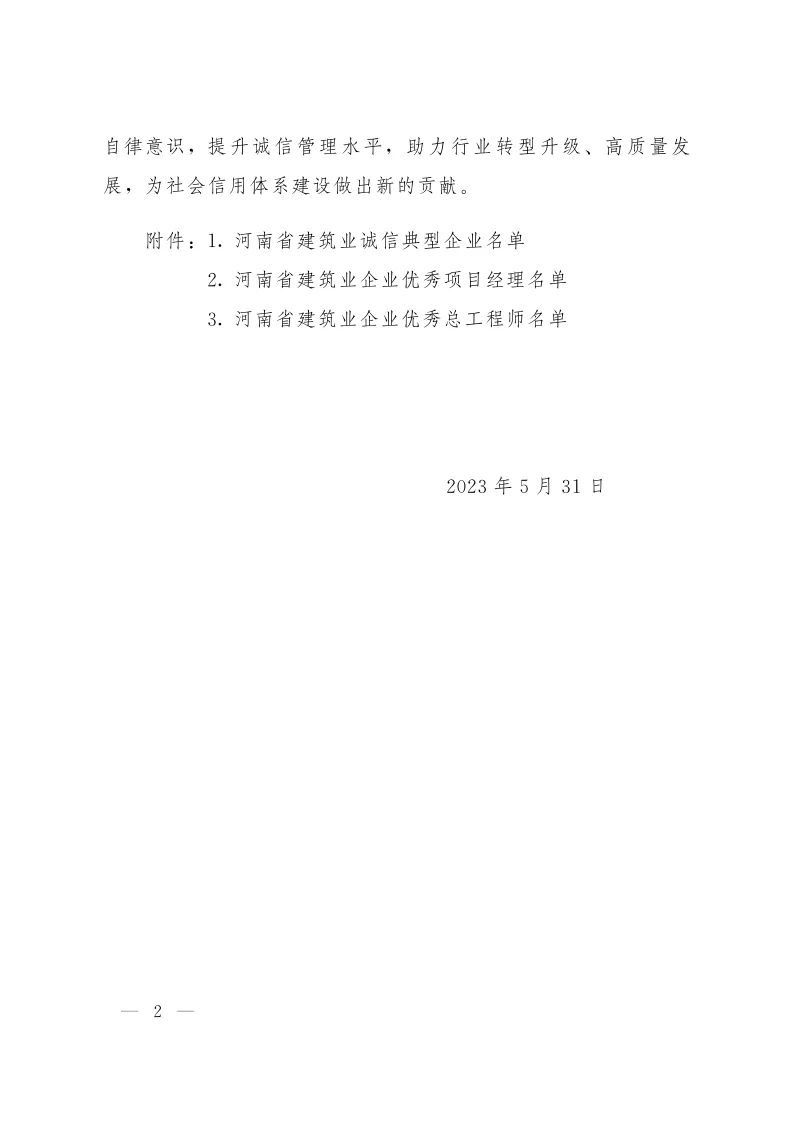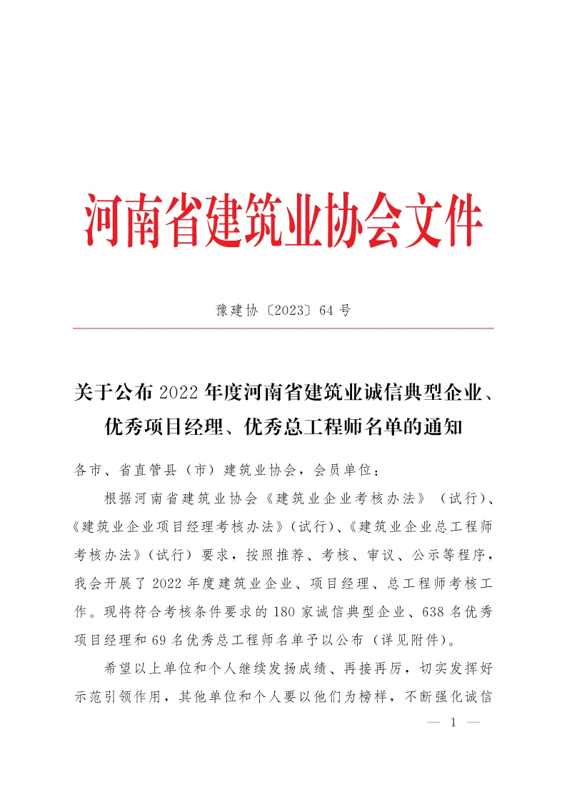 近日,河南省建筑業(yè)協會發(fā)布《關于公布2022年度河南省建筑業(yè)誠信典型企業(yè)、優(yōu)秀項目經理、優(yōu)秀總工程師名單的通知》(豫建協【2023】64號),對180家誠信典型企業(yè)、638名優(yōu)秀項目經理和69名優(yōu)秀總工程師名單予以公布,我集團公司榮獲“河南省建筑業(yè)誠信典型企業(yè)”,郭瑞峰等18名同志榮獲“河南省建筑業(yè)企業(yè)優(yōu)秀項目經理”,王磊同志榮獲“河南省建筑業(yè)企業(yè)優(yōu)秀總工程師”。