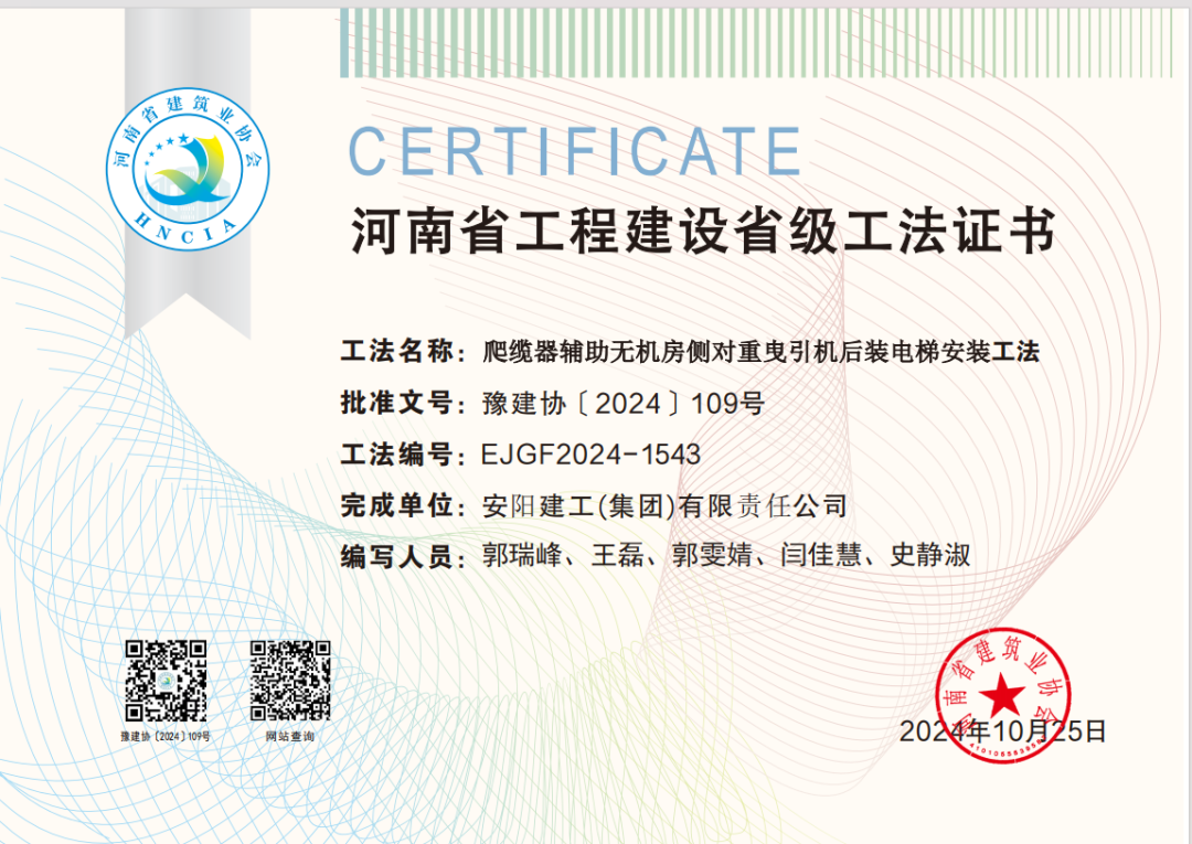 近日,集團(tuán)公司技術(shù)創(chuàng)新成果再創(chuàng)佳績(jī)。公司申報(bào)的《爬纜器輔助無(wú)機(jī)房側(cè)對(duì)重曳引機(jī)后裝電梯安裝工法》順利通過省協(xié)會(huì)專家評(píng)審,榮獲2024年“河南省省級(jí)工法”。 近年來,集團(tuán)公司高度重視技術(shù)研發(fā)和改革創(chuàng)新,加大科技研發(fā)投入,組織實(shí)施技術(shù)創(chuàng)新和攻關(guān),努力提高企業(yè)的施工技術(shù)水平及科技含量,取得眾多技術(shù)研發(fā)成果,解決了各類技術(shù)難題,持續(xù)為企業(yè)構(gòu)建一個(gè)良好的技術(shù)管理平臺(tái),為推動(dòng)集團(tuán)高質(zhì)量發(fā)展奠定了堅(jiān)實(shí)基礎(chǔ)。 此次工法申報(bào)的成功,體現(xiàn)了集團(tuán)公司技術(shù)水平和施工能力,為提升企業(yè)核心競(jìng)爭(zhēng)力、塑造企業(yè)品牌形象提供了重要支撐。我們將不斷加強(qiáng)科技創(chuàng)新和技術(shù)積累,做好工法的技術(shù)跟蹤和工藝的完善工作,保持工法的先進(jìn)性和適用性,不斷提高建設(shè)工程的施工技術(shù)水平和工程科技含量,鑄就更多精品工程,推動(dòng)公司創(chuàng)新能力再上一個(gè)新臺(tái)階!
