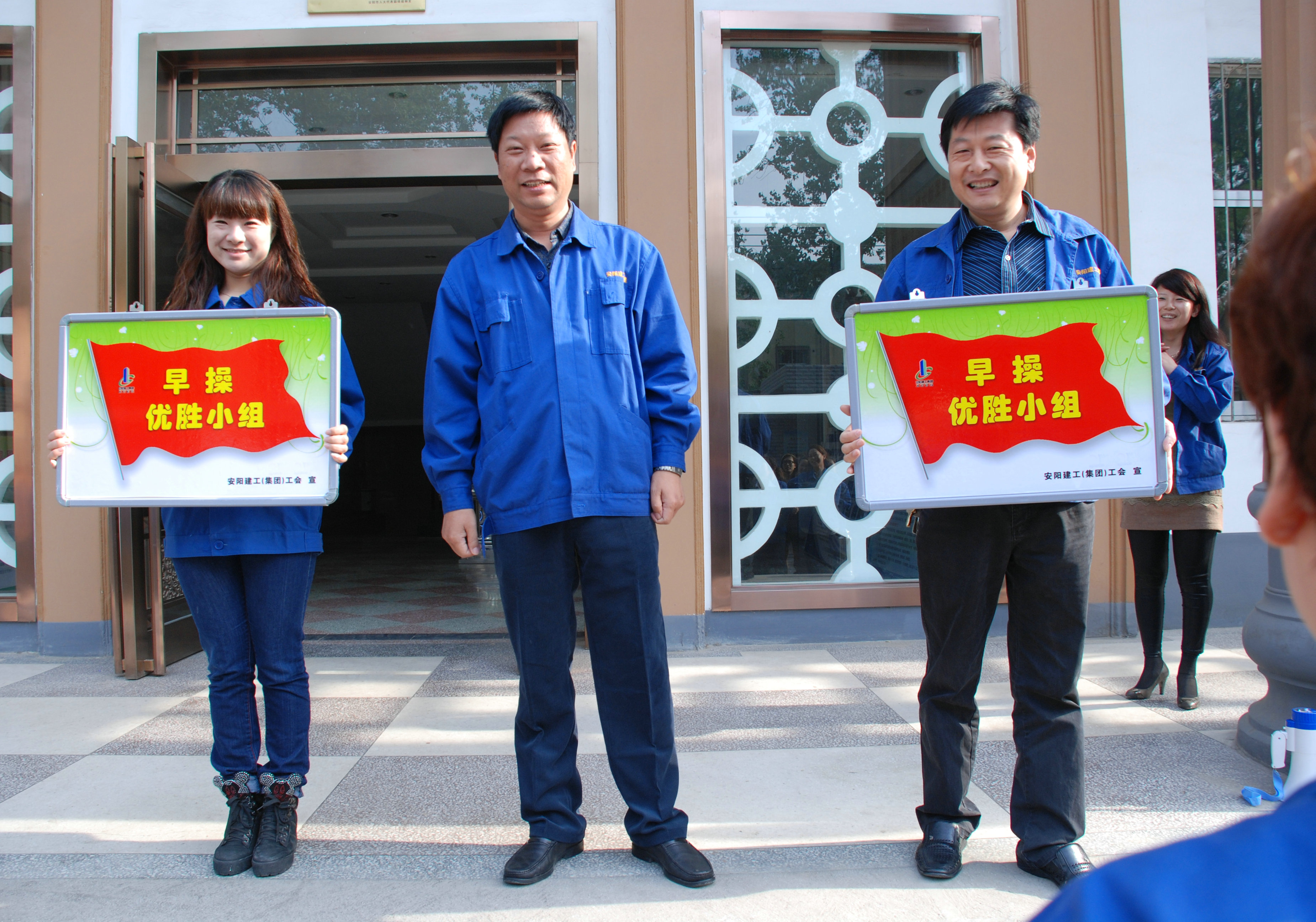 今年進(jìn)入四月份以來(lái),公司工會(huì)在公司繼續(xù)開(kāi)展了陽(yáng)光早操運(yùn)動(dòng),并在七個(gè)小組之間開(kāi)展了早操優(yōu)勝小組競(jìng)賽活動(dòng),通過(guò)七彩轉(zhuǎn)盤(pán)軍事化點(diǎn)名活動(dòng)等進(jìn)一步規(guī)范了早操紀(jì)律。在四月份競(jìng)賽中財(cái)務(wù)、審計(jì)小組和人力資源、勞務(wù)公司小組旗開(kāi)得勝獲得了優(yōu)勝小組的榮譽(yù)稱號(hào),工會(huì)對(duì)優(yōu)勝小組進(jìn)行了表?yè)P(yáng),當(dāng)場(chǎng)授予了“早操流動(dòng)小紅旗”。公司工會(huì)要求其他小組在5月份競(jìng)賽中向優(yōu)勝小組學(xué)習(xí),以他們?yōu)榘駱樱吩谀_下,志在心中,你追我趕爭(zhēng)上游,百舸爭(zhēng)流奪紅旗,讓流動(dòng)紅旗真正的“動(dòng)”起來(lái),讓更多的流動(dòng)紅旗在建工飄起來(lái)。