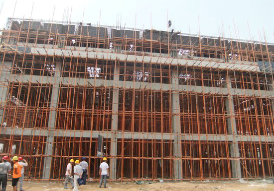 安陽建工邯鄲分公司承建的臨漳文化藝術(shù)中心項目,占地150畝,建筑面積13165平方米,計劃投資4500萬元,集大型會議中心、文化演藝中心、影視播放中心、群眾文化活動中心為一體。其中會議大廳跨度20米,高13.5米,長40米,附跨高度8.5米,建筑面積約2000平方米,結(jié)構(gòu)施工為高支模系統(tǒng),是本工程的難點和重點。施工前,公司工程部及技術(shù)中心組織了支模方案論證,并多次到現(xiàn)場指導(dǎo)施工,進(jìn)行模板驗收,制定澆筑方案。7月15日進(jìn)行砼澆筑,采用兩臺泵車,經(jīng)過10個小時的澆筑,順利完成會議大廳結(jié)構(gòu)施工。