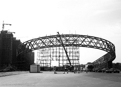 11日上午,記者根據(jù)高粲反映的情況,來(lái)到位于洛伊快速通道伊川界的伊川北大門施工現(xiàn)場(chǎng)看到,該大門外形是巨大的U形鋼架結(jié)構(gòu)拱門,外觀為紅色。整個(gè)拱門呈向北傾倒之勢(shì),兩端用方形支柱撐起,拱門四周搭建的腳手架,顯示出該拱門仍在建設(shè)之中。