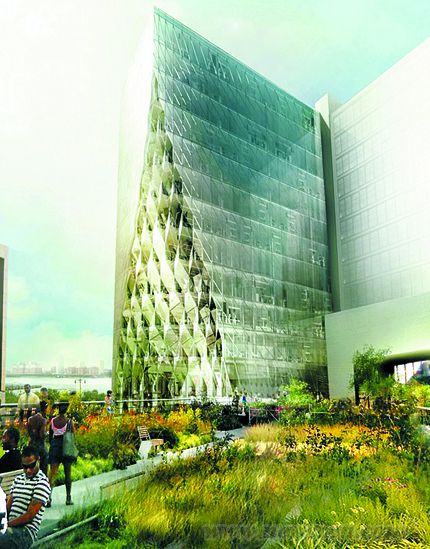 這座水晶般的大廈在陽(yáng)光下閃閃發(fā)光,并有著令人驚異的奇特身姿。大廈的東邊是第十大道和林肯公路,西邊是哈德遜河,因而其能夠?qū)⒐饩€和空氣從空曠的街道折射到高線上,照亮街區(qū)內(nèi)部的花園。