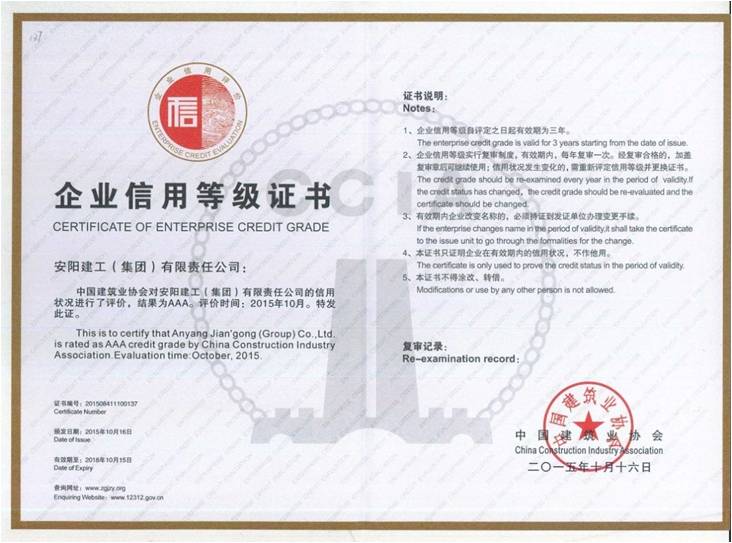 2016年1月7日,中國建筑業(yè)協(xié)會在珠海隆重召開全國建筑業(yè)AAA級信用企業(yè)暨中國建筑業(yè)雙百強(qiáng)企業(yè)發(fā)布會,向我公司在內(nèi)的共277家2015年度全國建筑業(yè)AAA級信用企業(yè)和榮獲2014年度雙百強(qiáng)的企業(yè)頒發(fā)獎牌和證書,我公司很榮幸的作為企業(yè)代表上臺領(lǐng)取了AAA級信用企業(yè)證書。