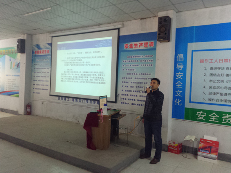 為了提高工人安全意識(shí),排除工地安全隱患,杜絕安全事故發(fā)生,海悅名門(mén)項(xiàng)目部于2016年3月15日,利用午休時(shí)間,召開(kāi)了本年度的三級(jí)安全教育培訓(xùn)大會(huì),海悅名門(mén)項(xiàng)目所有人員和公司其他項(xiàng)目上的安全員一同參加,約計(jì)300余人。會(huì)上首先為大家放映了安全教育短片,然后分別請(qǐng)公司工程部馮亮部長(zhǎng)、海悅名門(mén)項(xiàng)目經(jīng)理賈成偉、副經(jīng)理張磊、安全主管崔相平對(duì)本項(xiàng)目的一線員工進(jìn)行了一二三級(jí)安全教育培訓(xùn)。臺(tái)下工人聽(tīng)的認(rèn)真,臺(tái)上領(lǐng)導(dǎo)講的生動(dòng),整場(chǎng)大會(huì)井然有序。