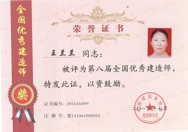 此次會議上,公司總工程師王蘭蘭同志被評為“第八屆全國優(yōu)秀建造師”榮譽(yù)稱號。公司將更加重視科技進(jìn)步與技術(shù)創(chuàng)新工作,積極開展科研攻關(guān),為建筑業(yè)的持續(xù)健康發(fā)展做出更大的貢獻(xiàn)。