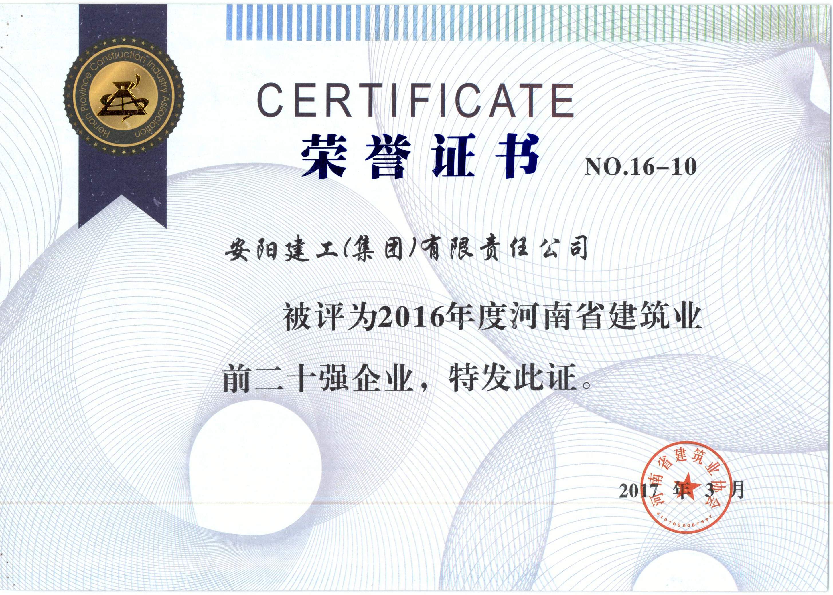 我公司被評為2016年河南省建筑業(yè)前二十強企業(yè)