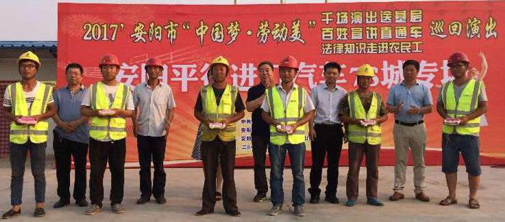 6月26、27日下午,公司組織機關黨員干部分別到精密儀器二期項目部、新能源汽車項目部“送法律、送文化、送清涼”。機關黨員在精密儀器二期項目部,首先和項目部人員一道對施工現(xiàn)場環(huán)保情況進行了檢查,并一同對做的不到位的衛(wèi)生死角、環(huán)境污點進行了清理和打掃。下午5時,安陽市建筑項目工會聯(lián)合會副主席、安陽市城建水利工會梁主席,公司工會主席馬松林等領導來到了活動現(xiàn)場,并為項目部工人贈送了綠豆、毛巾、西瓜等慰問品,宣講團為農民工進行了“法律知識走進農民工”宣講,大家觀看了“中國夢