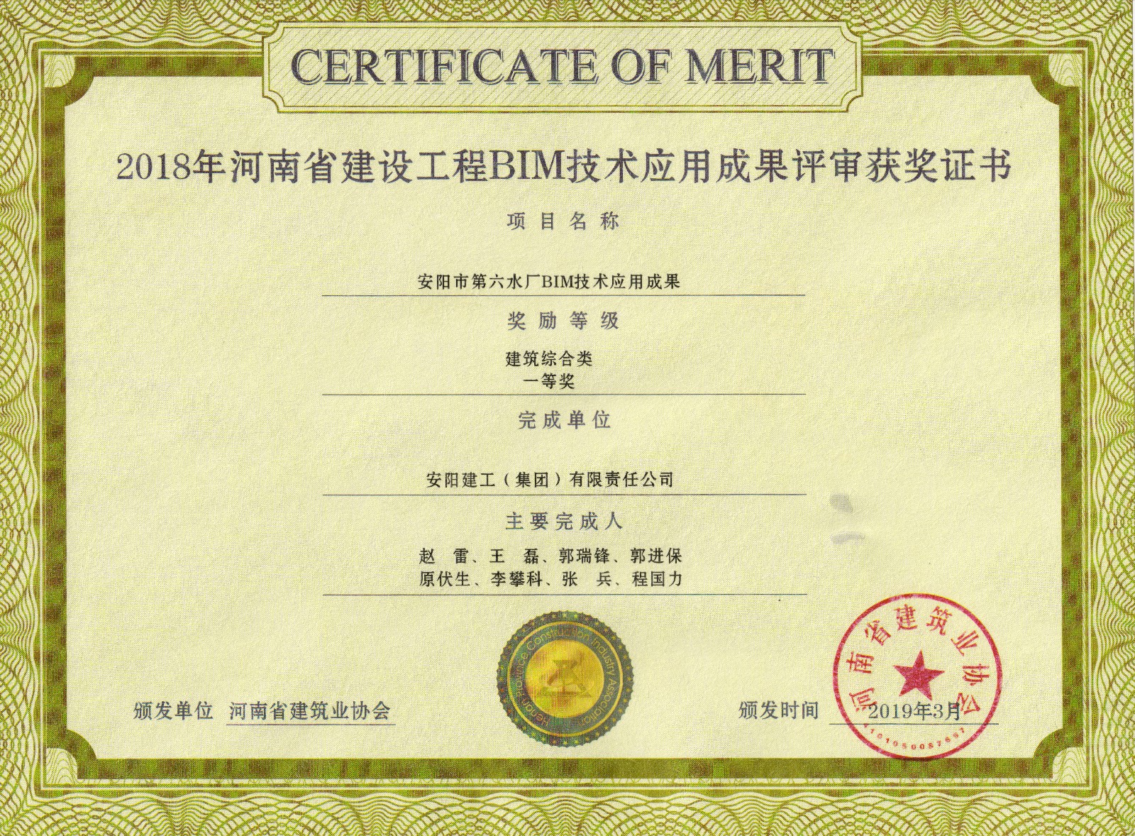 我公司安陽市第六水廠BIM技術(shù)應(yīng)用成果榮獲18年省一等獎