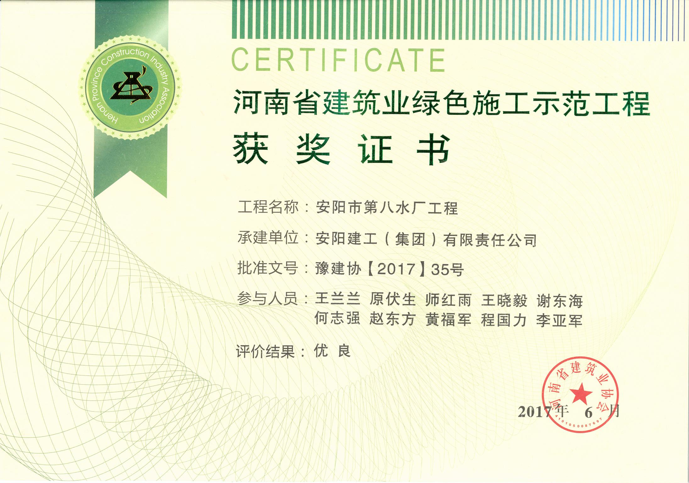 我公司安陽市第八水廠項目榮獲17年省建筑業(yè)綠色施工示范工程