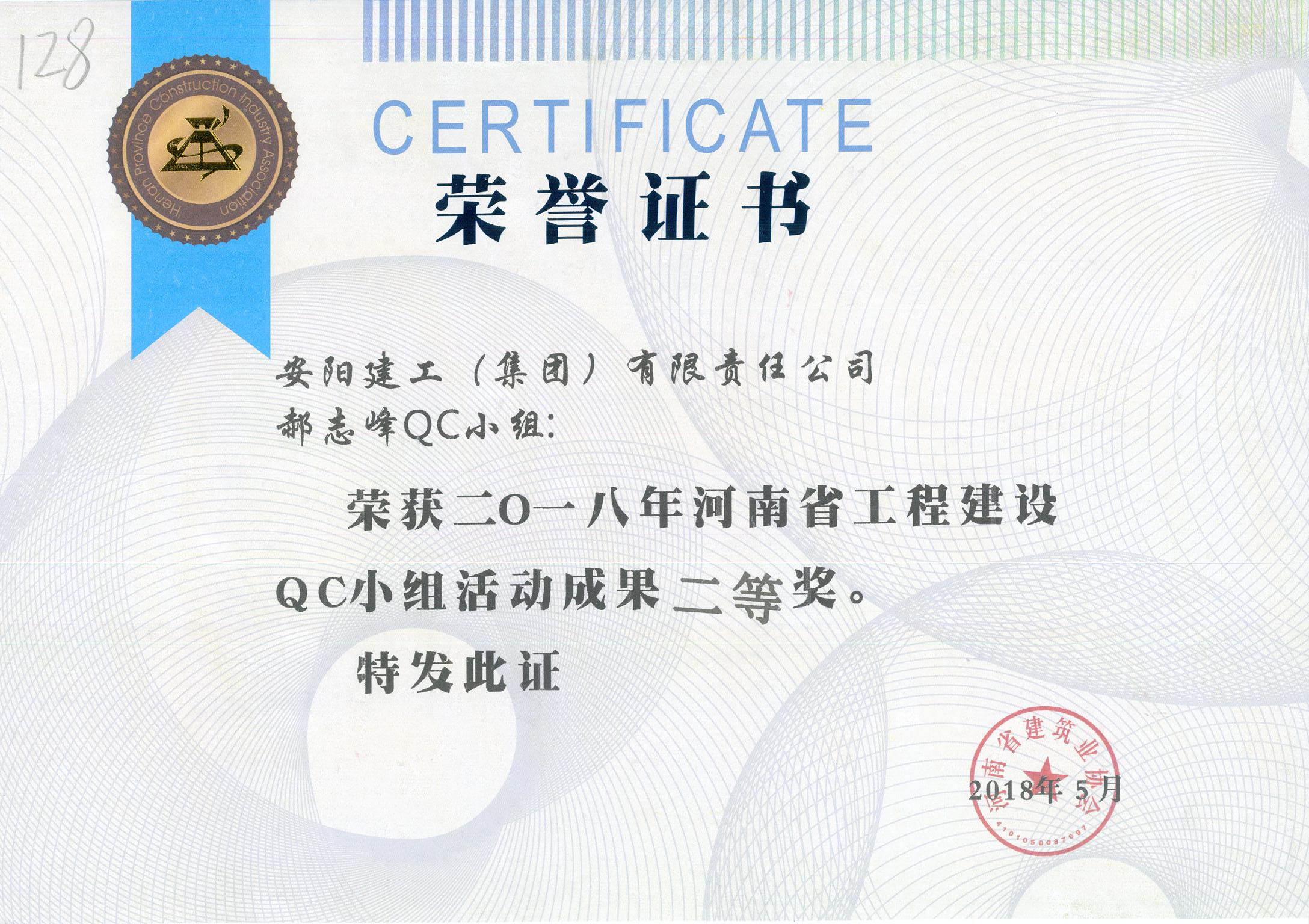 我公司郝志峰QC小組榮獲2018年河南省工程建設(shè)QC小組活動成果二等獎