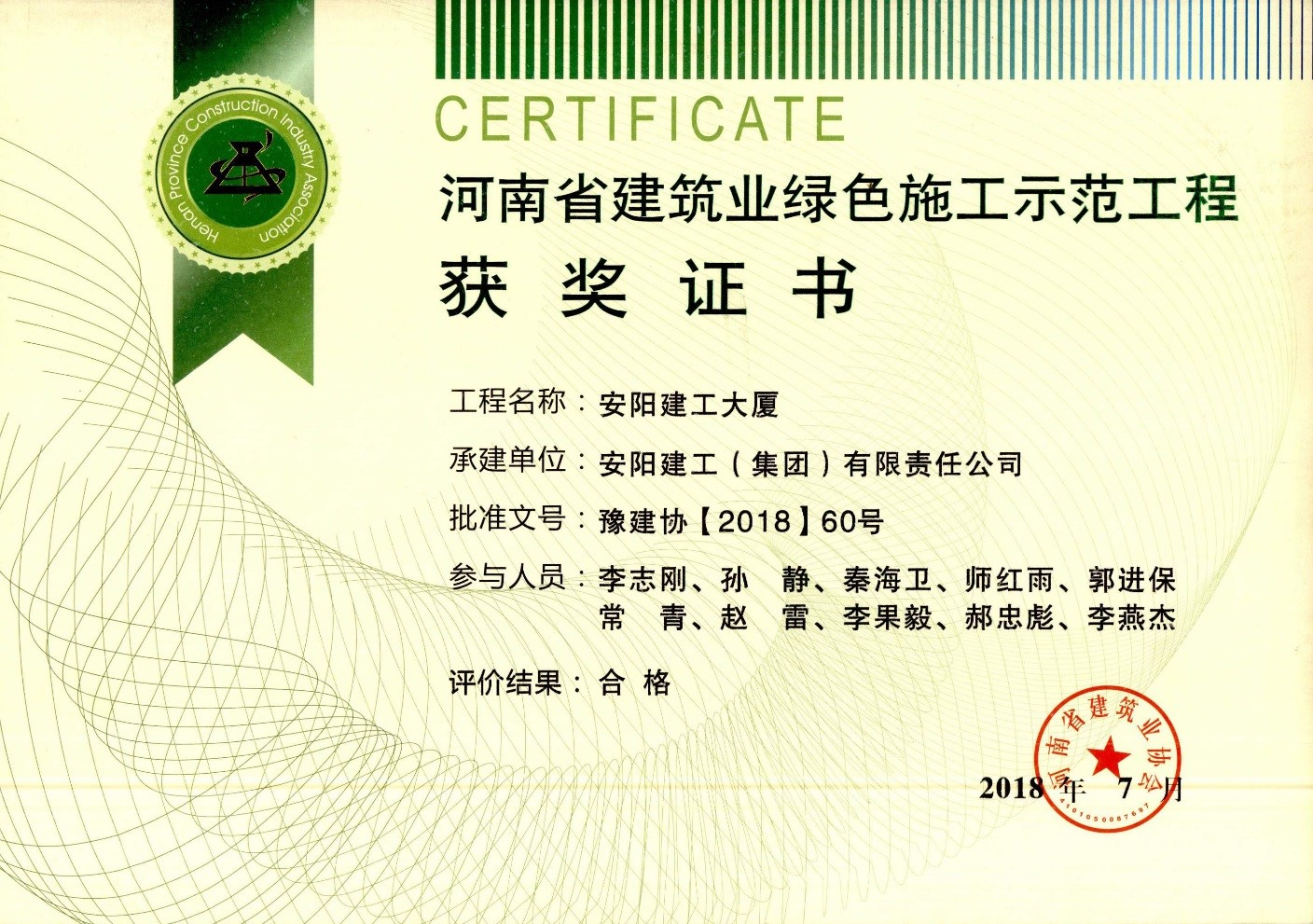 我公司安陽市建工大廈項(xiàng)目榮獲18年省建筑業(yè)綠色施工示范工程