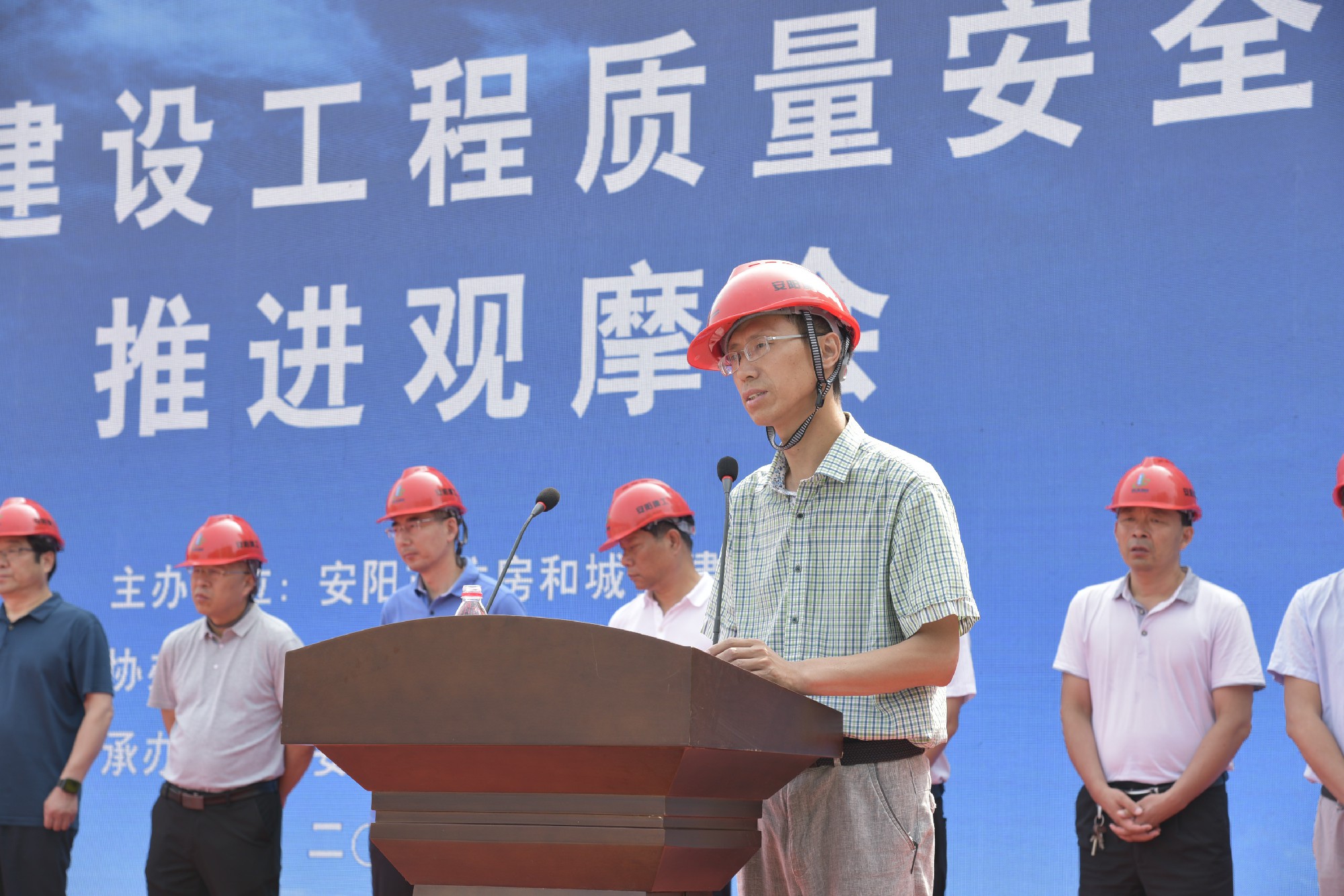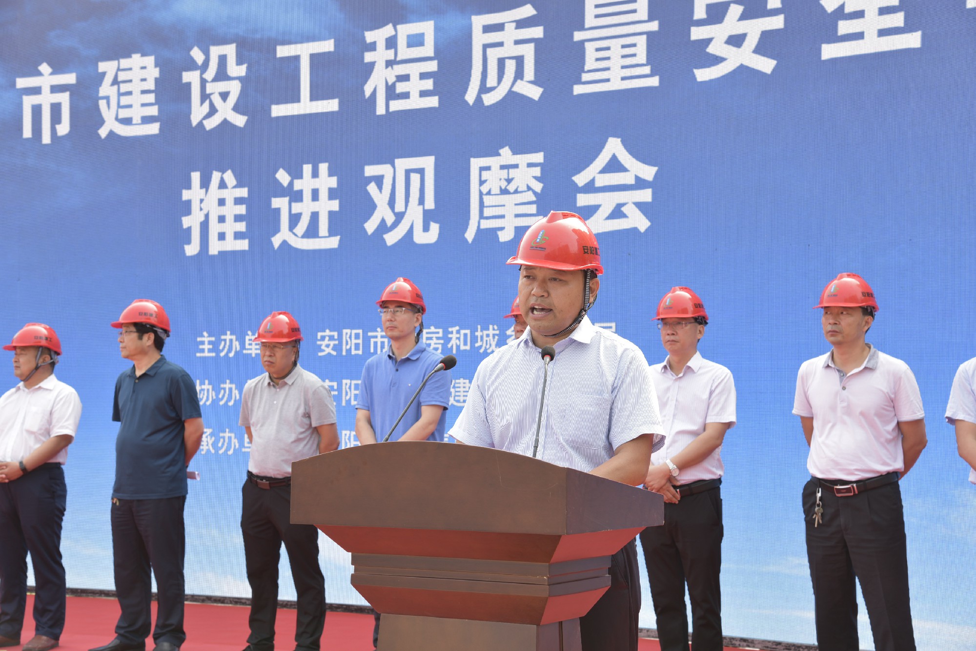 6月24日上午,由安陽(yáng)市住房和城鄉(xiāng)建設(shè)局主辦,高新區(qū)建筑工程管理處協(xié)辦,安陽(yáng)建工集團(tuán)承辦的“安陽(yáng)市建設(shè)工程質(zhì)量安全手冊(cè)推進(jìn)觀(guān)摩會(huì)”在我公司海悅名郡項(xiàng)目施工現(xiàn)場(chǎng)順利召開(kāi)。安陽(yáng)市住建局黨組成員、總工程師許會(huì)生,安陽(yáng)市住建局工程質(zhì)量安全監(jiān)管科科長(zhǎng)李奇琪,安陽(yáng)市建筑工程質(zhì)量監(jiān)督站站長(zhǎng)張向民,安陽(yáng)市建設(shè)安全監(jiān)督站站長(zhǎng)王進(jìn)現(xiàn),安陽(yáng)市市政工程質(zhì)量監(jiān)督站站長(zhǎng)李虎,各縣(市、區(qū))住建局主管副局長(zhǎng)、質(zhì)監(jiān)站、安監(jiān)站站長(zhǎng)等領(lǐng)導(dǎo)出席。集團(tuán)公司董事長(zhǎng)謝海如親臨現(xiàn)場(chǎng)觀(guān)摩指導(dǎo)、副總經(jīng)理劉民躬身一線(xiàn)督促安排。市各建筑工地的建設(shè)、施工、監(jiān)理單位相關(guān)人員約1700余人參加了此次觀(guān)摩活動(dòng)。