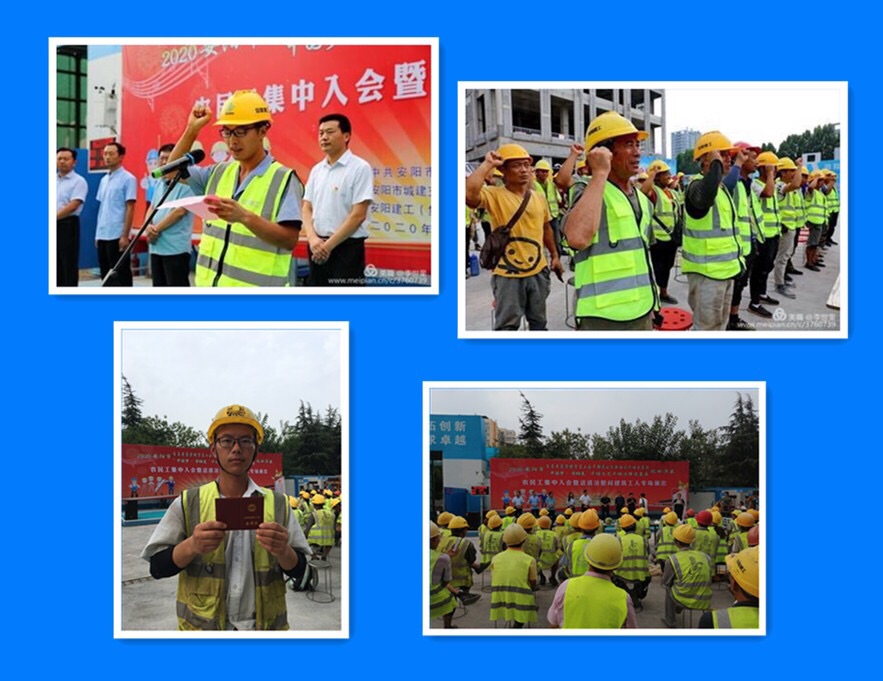 活動伊始,安陽建工集團(tuán)副總經(jīng)理劉民致了歡迎詞,并介紹了建工集團(tuán)發(fā)展?fàn)顩r;隨后舉行了建筑行業(yè)農(nóng)民工集中入會儀式,活動現(xiàn)場農(nóng)民工代表進(jìn)行了發(fā)自肺腑的發(fā)言.并進(jìn)行了集體入會宣誓。安陽市總工會黨組成員、副主席朱繼衡在儀式上做了講話,并為農(nóng)民工發(fā)放了工會會員證和夏季降溫慰問品,和一線的建筑工人聆聽了法律宣講、觀看了職工藝術(shù)團(tuán)精彩的文藝演出。