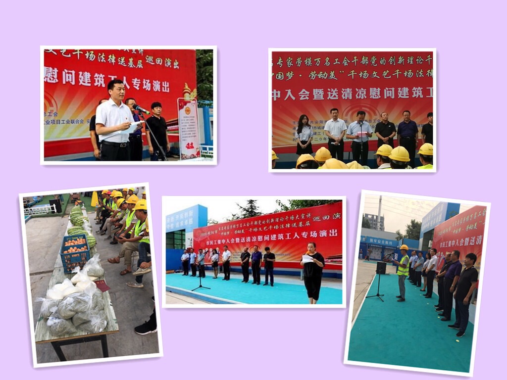 7月21日下午,農(nóng)民工集中入會暨送清涼慰問建筑工人專場演出活動,在安陽建工集團(tuán)海悅名郡工程項目施工現(xiàn)場舉行,安陽市總工會黨組成員、副主席朱繼衡,安陽市城建交通水利工會主席梁曦、副主席靳遠(yuǎn),安陽市建筑業(yè)項目工會聯(lián)合會主席郜慶,安陽市建筑業(yè)協(xié)會秘書長陶思孝,建筑業(yè)協(xié)會副秘書長、安陽建工集團(tuán)董事劉艷軍,安陽建工集團(tuán)工會主席馬松林,安陽建工集團(tuán)副總經(jīng)理劉民等相關(guān)同志,來到工地現(xiàn)場參加了活動。