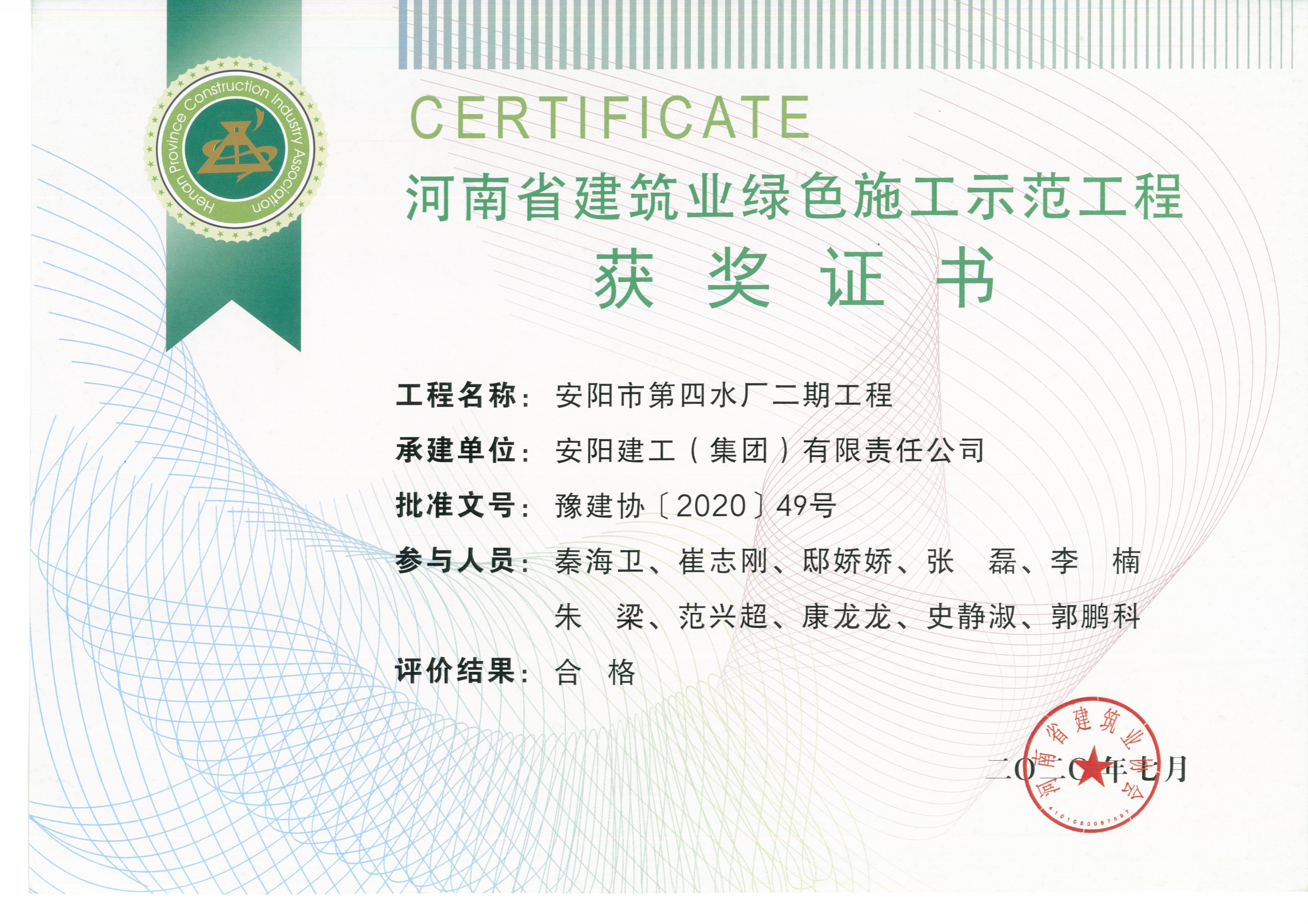 我公司安陽(yáng)市第四水廠二期工程項(xiàng)目榮獲2020年河南省建筑業(yè)綠色施工示范工程