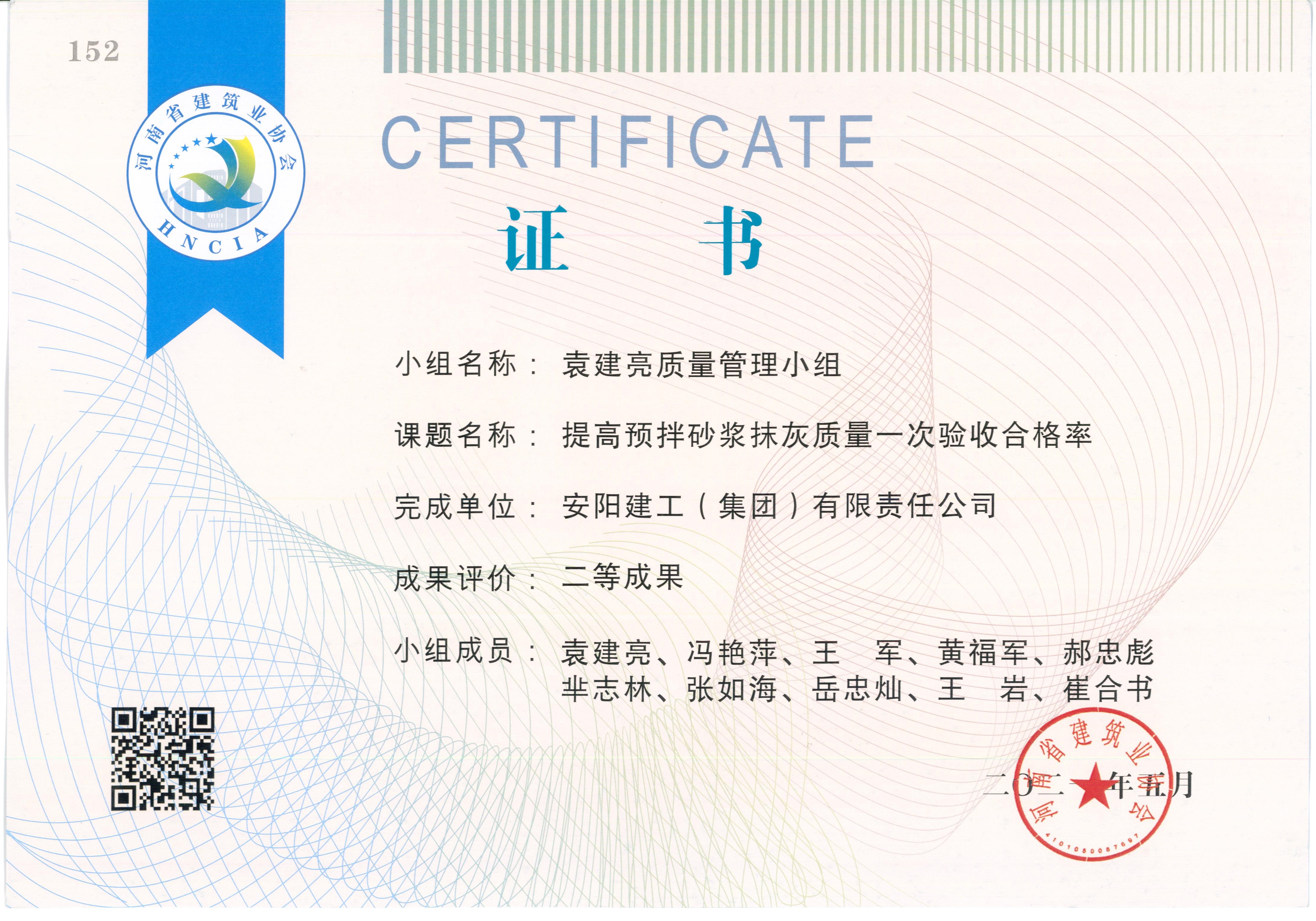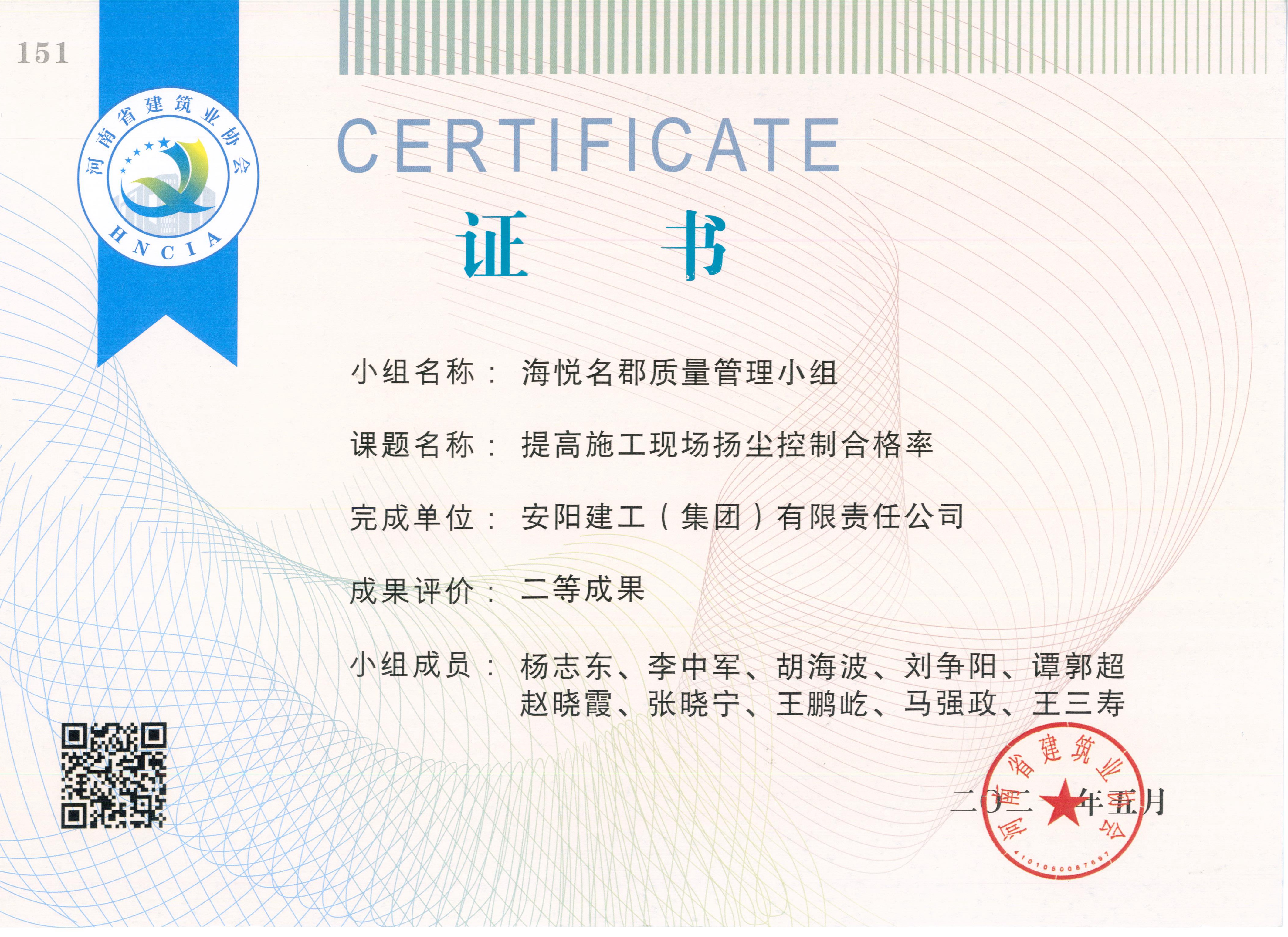 集團公司共有5項成果參加本次交流會,海悅國際項目QC小組、海悅光明城項目張姣QC小組榮獲2021年度河南省工程建設優(yōu)秀QC小組活動成果一類成果;海悅名郡項目QC小組、御水園項目袁建亮QC小組、繡江南智鷹QC小組榮獲2021年度河南省工程建設優(yōu)秀QC小組活動成果二類成果。