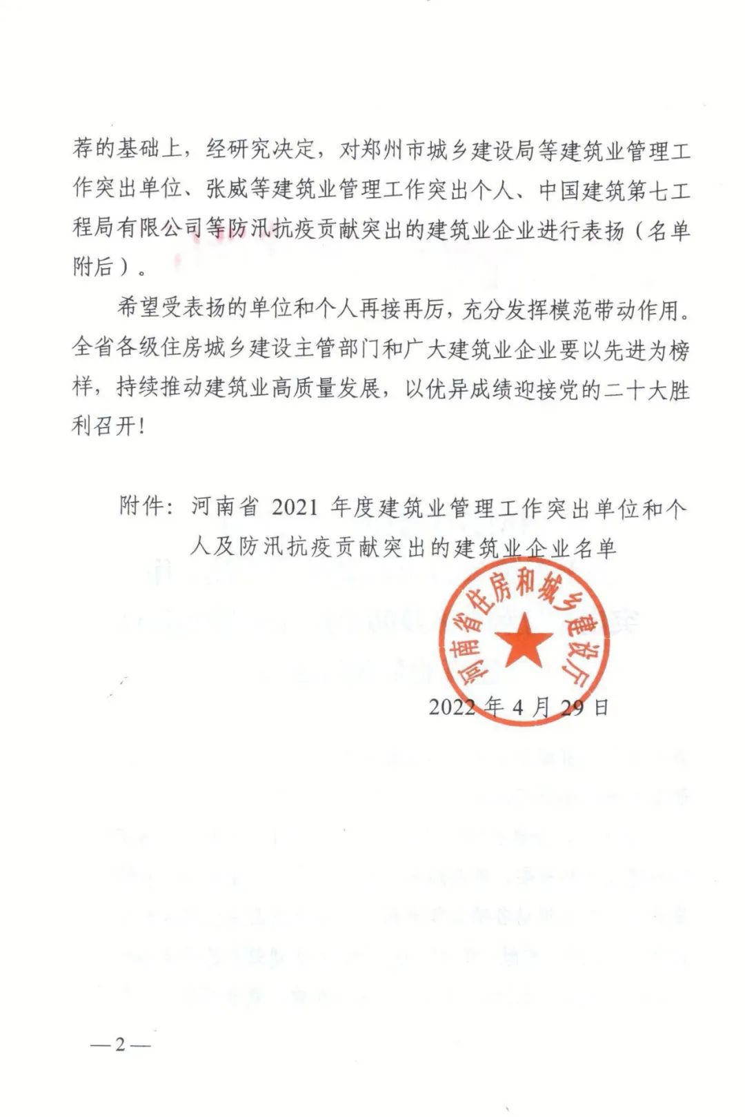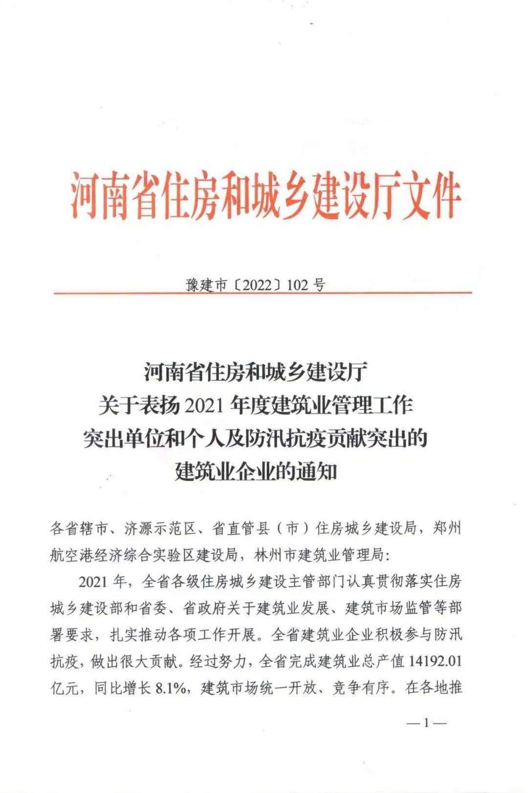 近日,河南省住房和城鄉(xiāng)建設(shè)廳印發(fā)《關(guān)于表揚2021年度建筑業(yè)管理工作突出單位和個人及防汛抗疫貢獻(xiàn)突出的建筑業(yè)企業(yè)的通知》(豫建市〔2022〕102號)對河南省20家防汛抗疫貢獻(xiàn)突出的建筑業(yè)企業(yè)進(jìn)行表揚。