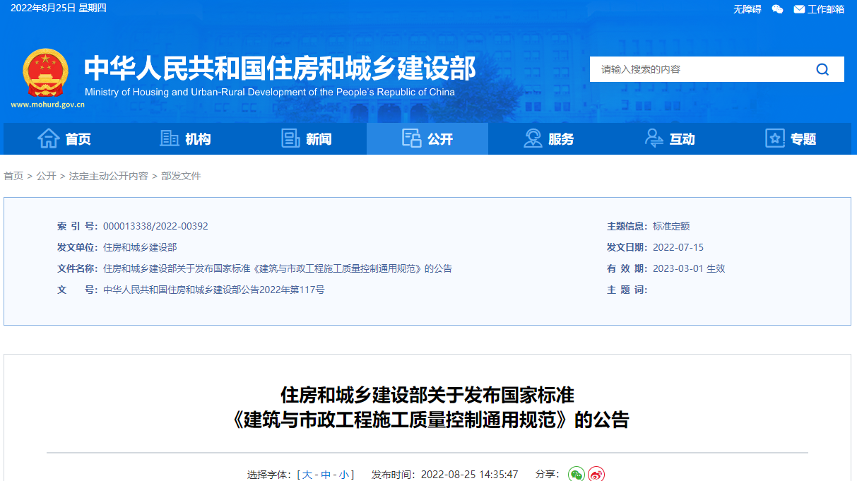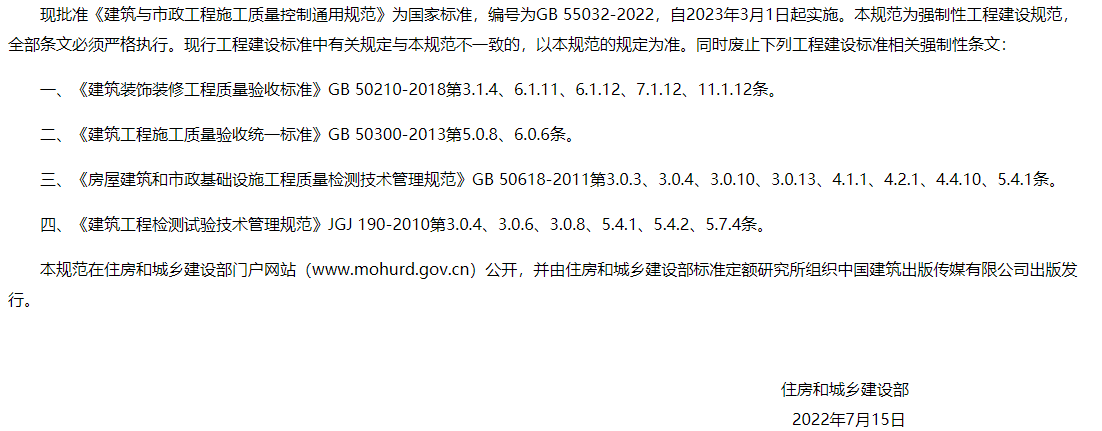 原文鏈接及附件下載:住房和城鄉(xiāng)建設(shè)部關(guān)于發(fā)布國(guó)家標(biāo)準(zhǔn) 《建筑與市政工程施工質(zhì)量控制通用規(guī)范》的公告 https://www.mohurd.gov.cn/gongkai/fdzdgknr/zfhcxjsbwj/202208/20220825_767714.html