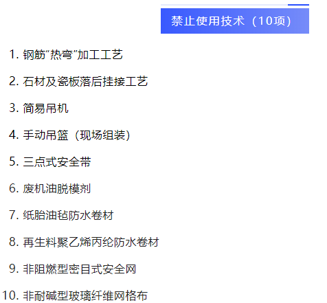 近日,住建部官網(wǎng)發(fā)布《關(guān)于《房屋市政工程禁止和限制使用技術(shù)目錄(2022年版)(征求意見稿)》公開征求意見的通知》,簡易吊機(jī)、鋼筋“熱彎”加工工藝、三點式安全帶等10項技術(shù)擬被禁止使用。輪扣式腳手架、支撐架、扣件式鋼管卸料平臺、鋼管扣件型附著式升降腳手架等16項技術(shù)擬被限制使用。