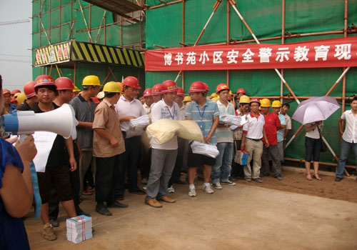 7月15日上午,安陽市總工會(huì)副主席宋忠平、保障部部長(zhǎng)呂啟霞、城建水利工會(huì)副主席董江紅一行,來到我公司承建的如火如荼的博書苑工地,看望在高溫時(shí)節(jié)奮戰(zhàn)在施工一線的建筑工人,并為他們送去了毛巾、風(fēng)油精、汗衫、《農(nóng)民工知識(shí)讀本》等防暑降溫慰問品,市總工會(huì)給工地帶來了關(guān)懷帶來了愛,同時(shí)也為工地帶來了歡快活潑的少兒舞蹈“愛的人間”,小朋友們用稚嫩的聲音深情地說:工人叔叔辛苦了!她們的熱情感染了在場(chǎng)的每個(gè)人。宋主席一邊給工人送上慰問品,一邊關(guān)切地詢問他們的工作、生活情況,囑咐要注意身體健康、防暑降溫。他說:“博書苑是安陽市最大的經(jīng)濟(jì)適用房,一直受到市各級(jí)領(lǐng)導(dǎo)的關(guān)注,你們冒著酷暑仍然堅(jiān)守在工作崗位上,辛苦了,我向你們表示感謝。”他叮囑工地要合理安排工期計(jì)劃,一定要讓工人注意合理休息。公司副總經(jīng)理郝志峰、工會(huì)主席馬松林到現(xiàn)場(chǎng)參加了活動(dòng),郝經(jīng)理表示:我們要更加努力的工作,克服高溫酷暑,全力投入生產(chǎn),以實(shí)際行動(dòng)感謝市工會(huì)的關(guān)心支持!面對(duì)還將持續(xù)下去的高溫天氣,我們要繼續(xù)發(fā)揚(yáng)艱苦奮斗、無私奉獻(xiàn)的精神,堅(jiān)守工作崗位,安全生產(chǎn),安全度夏。