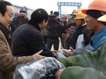 元月10日(周日)上午,省總工會(huì)及市總工會(huì)領(lǐng)導(dǎo)冒著嚴(yán)寒,帶著精美的羽絨服、精制的大米、白面和美味的豬肉及《農(nóng)民工知識(shí)讀本》來(lái)到我們公司施工的安陽(yáng)市電子信息學(xué)校工地,向建設(shè)一線職工和在這里務(wù)工的農(nóng)民工送去了溫暖,送去了工會(huì)組織對(duì)農(nóng)民工的深切關(guān)懷。