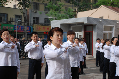 每天清晨,迎著噴薄而出的朝陽,員工統(tǒng)一著裝,整齊列隊(duì),在音樂的伴奏下集體做大眾廣播體操。員工們一絲不茍的神態(tài),筆挺高雅的工裝,整齊劃一的動(dòng)作,吸引了路人的駐足觀看,成為一道靚麗的風(fēng)景線。
